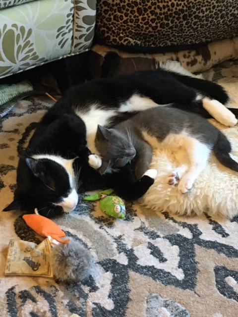 We luvs playing with them and are already besties! I like playing….for a bit and then Monkey keeps them occupied while I catch up on my sleeps…Monkey was exhausting me but now he has playmates…Meomys plan worked!