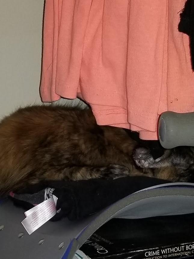 And here we see rebel continuing to hone her stealth skills I did not even notice her tucked up on top of my back brace lol sneaky lil space cadet she is. She has also been working tirelessly on her space walking but chooses to do it about 2 in the morning when 1) my phone is no where near me and 2) I am sleeping. I’ll get her though!